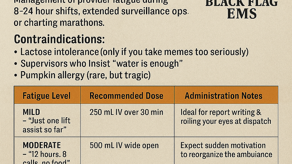 “Our clinical trials were clear: EMS providers on Pumpkin Spice NS demonstrated 147% increased charting speed, a 63% improvement in sarcasm tolerance, and a statistically significant reduction in station coffee pot homicide. We believe Pumpkin Spice IV represents the future of frontline hydration and caffeination. While further studies are ongoing, early data suggests this solution may be the single most important advancement in prehospital medicine since electricity.”